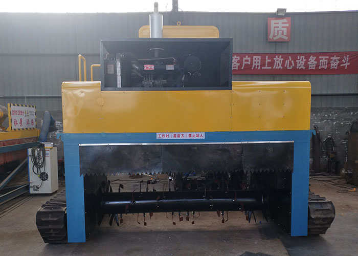 翻堆機采用履帶自行走式,由一人操控,應用防滑履帶,行走時整車騎跨在條形堆上,車過后形成新的條形堆,前后安裝擋板,可防止翻堆中物料飛散。該機可多種場合作業(yè),在物料發(fā)酵后期還具有破碎功能,整體結構剛性好,性能可靠。